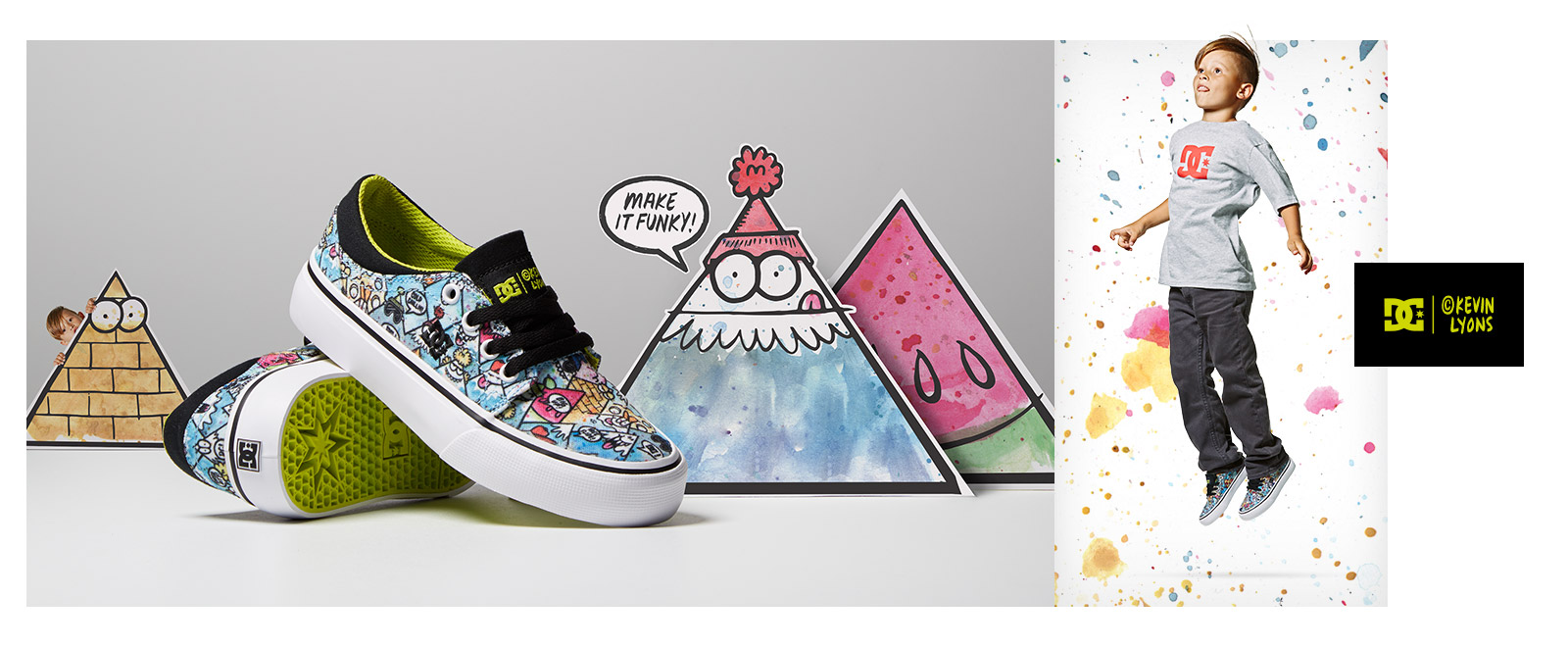 DC is proud to partner with internationally renowned artist, designer, typographer and creative director Kevin Lyons for a second, unique and inspired collaboration. This time around, Kevin lent his incredible talent to designing signature artwork for a youth capsule featuring youth Trase footwear.